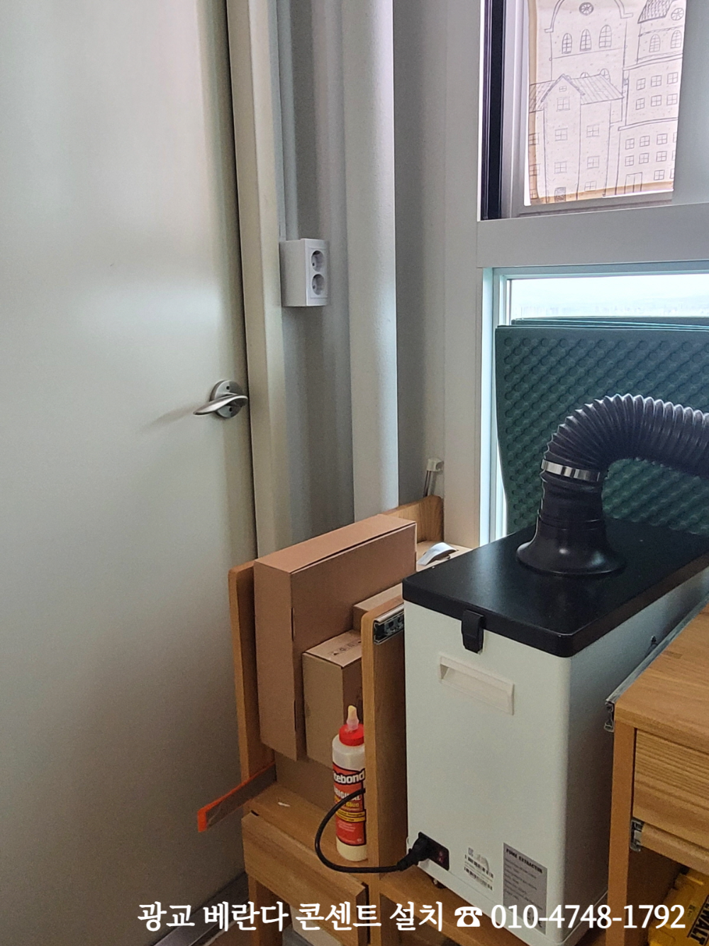 사실 이댁은 사장님께서 연락을 주셨는데, 안방베란다를 공작 작업실로 꾸며서 사용하고 계시더고요. 배기관이 달린 멋진 기계를 사용하려다 보니 발코니 내부에 콘센트가 있으면 좋겠다 싶어 연락주셨대요.